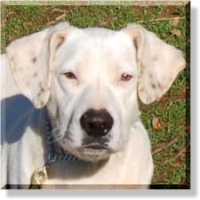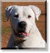 We believe Champ is a Dogo Argentino which is a farely rare breed from Argentina. Here is what the Rare Breed Atlas has to say about the Dogo Argentino. Champ is 3 years old and has a very sweet temperament. He would love to be a lap dog but at his size… 118 pounds! Yes he is on a diet! Sitting on laps is not an option.