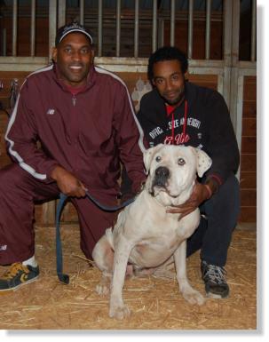 Champ is 3 years old and has a very sweet temperament. He would love to be a lap dog but at his size… 118 pounds! Yes he is on a diet! Sitting on laps is not an option. |