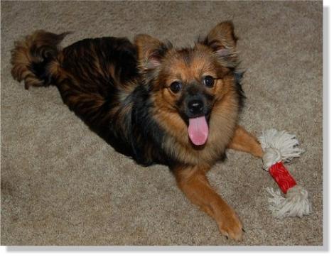 Meggie is about 1 year old and looks like she is a cross between a long haired Chihuahua and a Pomeranian.