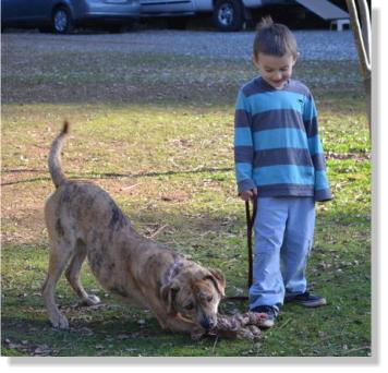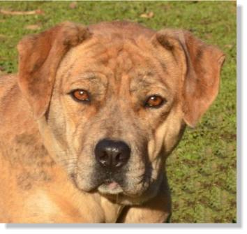 "Pumpkin had an owner who taught her to play rough, yet once she learns the rules, she plays ball nicely, she even knows how to dribble it with her mouth and play soccer with her paws. Pumpkin is learning the leash and listens well to correction. When she meets another dog, she is so eager to play that she approaches them quickly rather than gently. When corrected, she will make a gentler approach".