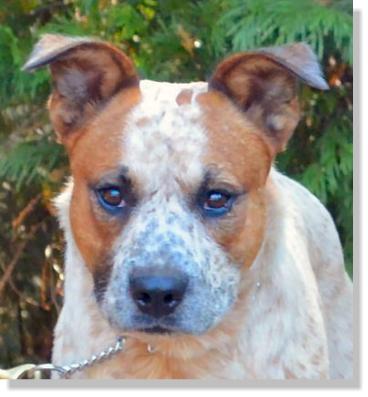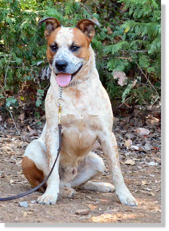 Mr. Mellow is what his name should be, however, someone dubbed him Scout. He is a Red Merle Queensland mix breed who weighs 56 pounds, is about 1-2 years old, has had his shots and tested heartworm negative.