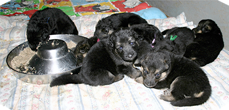 Around the feed bowl, Doc's always the last to stop eating! Eula is the one asleep in the bowl! |