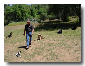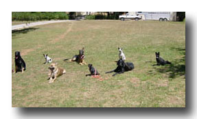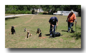 Here the dogs are being taught to hold a down position while the handlers leave them.