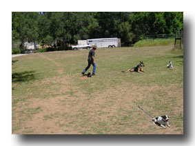Then we moved to the exercise where a person walks around and steps over or near the dogs. They are supposed to hold their down position. This was Buddy's (in the foreground) second class and he was not too happy with this. He was doing his best to get away.
