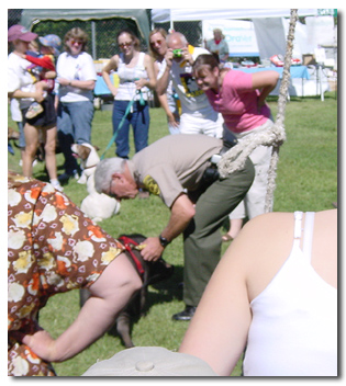 Margaret, Cal and Joe of Twin Cedar setup a Rally-O course where for a $5.00 donation to A-Pal, folks could try running their dogs through. Basic obedience exercises such as sit and heel are performed at each sign before moving to the next. It is a new sport intended to be fun for the dog and handler without the formalities of