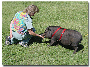Amador County Sheriff Mike Prizmitch (left) and Dr Allison Pillsbury of Foothill Veterinary Clinic share the honors of kissing Gordy the pig. They both raised over $160 each in contributions for the A-Pal of Amador County.